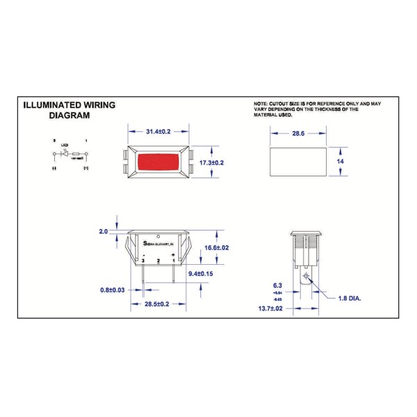 Its energy-efficient LED technology ensures long-lasting performance and is crafted for convenience and ease of installation. This indicator light requires no hardware or tools for setup. It self-locks into the proper panel cutout, measuring 14.0mm (.550") x 28.6mm (1.125"), ensuring a secure fit without the need for additional fasteners.